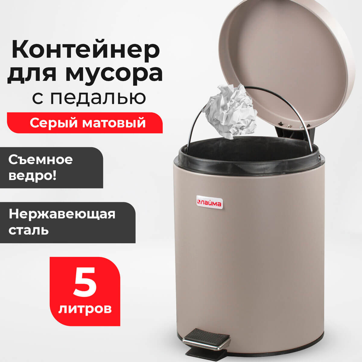 Ведро-контейнер для мусора (урна) с педалью LAIMA Classic, 5 л, серое, матовое, металл, со съемным внутренним ведром